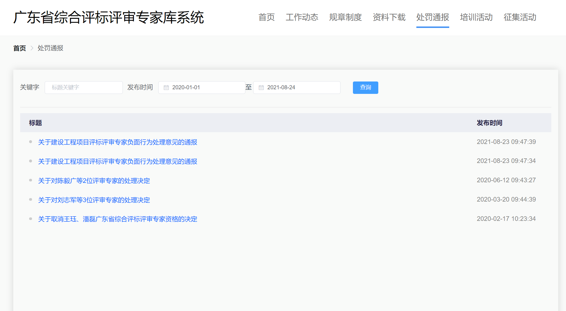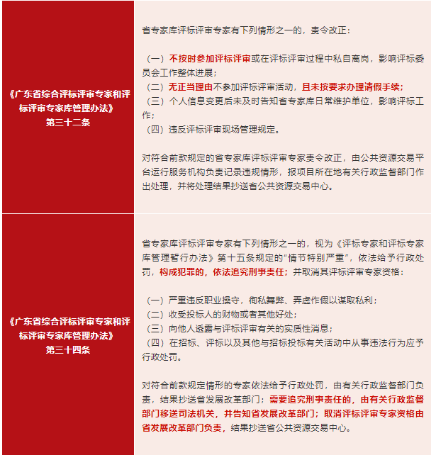 2020年至今,广东省综合评标评审专家库系统共对15名评标专家进行处罚通报,其中违反《广东省综合评标评审专家和评标评审专家库管理办法》第三十二条规定的评标专家共13人,5人因无正当理由不参与评标评审活动,且未按要求办理请假手续、不按时参加评标评审活动被责令改正,其余8人因迟到、缺席等负面行为被责令改正并记入违规记录;2名评标专家因犯串通投标罪,违反《广东省综合评标评审专家和评标评审专家库管理办法》第三十四条被取消广东省综合评标评审专家资格并永久移除出库。