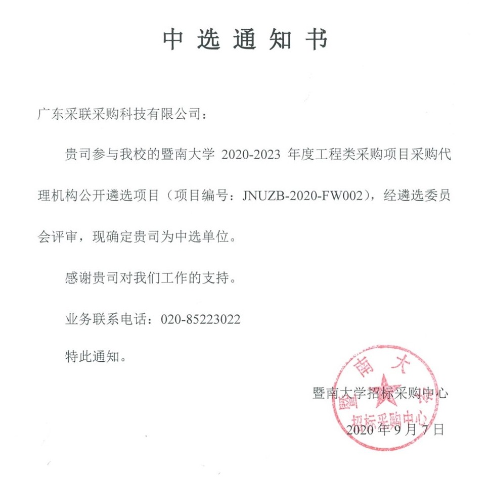 2020年8月2日,暨南大学开展了“2020-2023年度工程类采购代理机构”的遴选工作,广东采联采购科技有限taptap点点官网(以下简称:采联科技)成功入选为"暨南大学2020-2023年度工程类采购项目采购代理机构"。