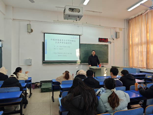 2024年11月28日下午16时,太阳成集团tyc122cc入口施雪军博士在4号教学楼4203教室举办了学术讲座,报告题目为《环氧树脂基复合材料的制备及其声学性能研究》,太阳成官网22级材料科学与工程专业的学生聆听了本次报告。