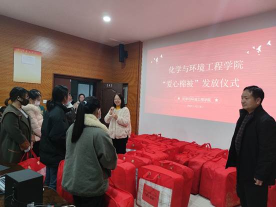 为切实做好家庭经济困难学生精准帮扶和资助育人工作,12月8日下午,太阳成集团tyc122cc入口在化学实验楼243会议室举行爱心棉被发放仪式。学院党委书记曹萍、党委副书记贺国旭及化学全体辅导员参加发放仪式。