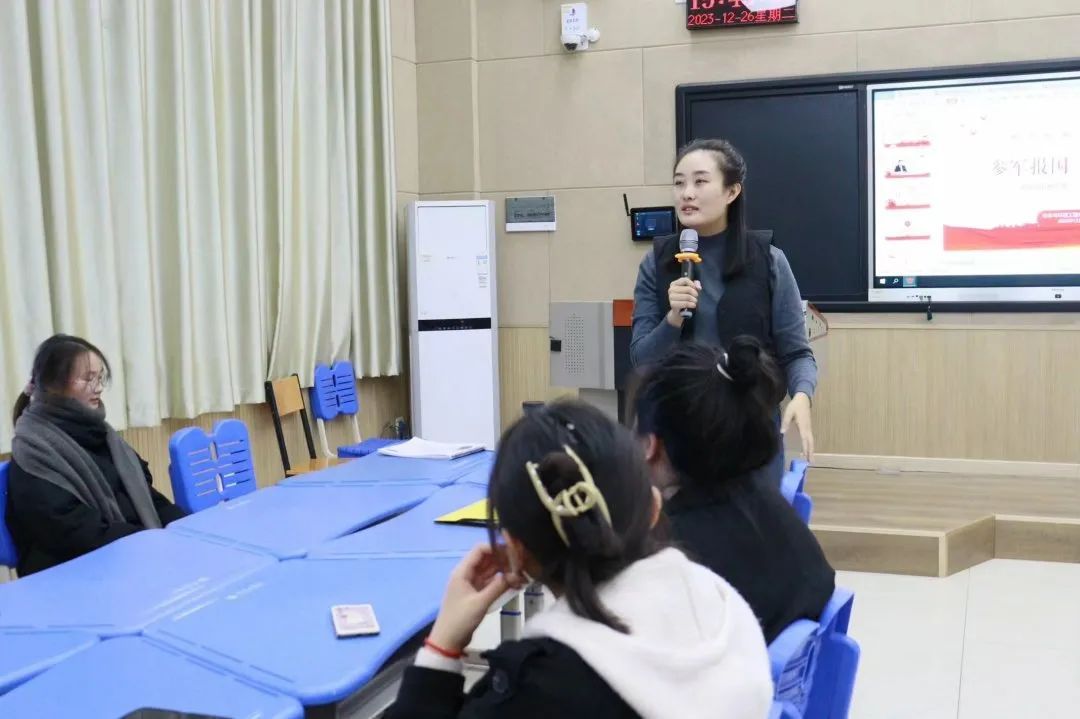 为了积极响应国家征兵号召,鼓励更多学生们参军报国,投身军营,太阳成官网于2024年12月26日下午在图书馆207进行了以“参军报国 无上荣光”为主题的征兵宣讲,本次宣讲会由辅导员史小倩主讲,2024级毕业生代表参加会议。